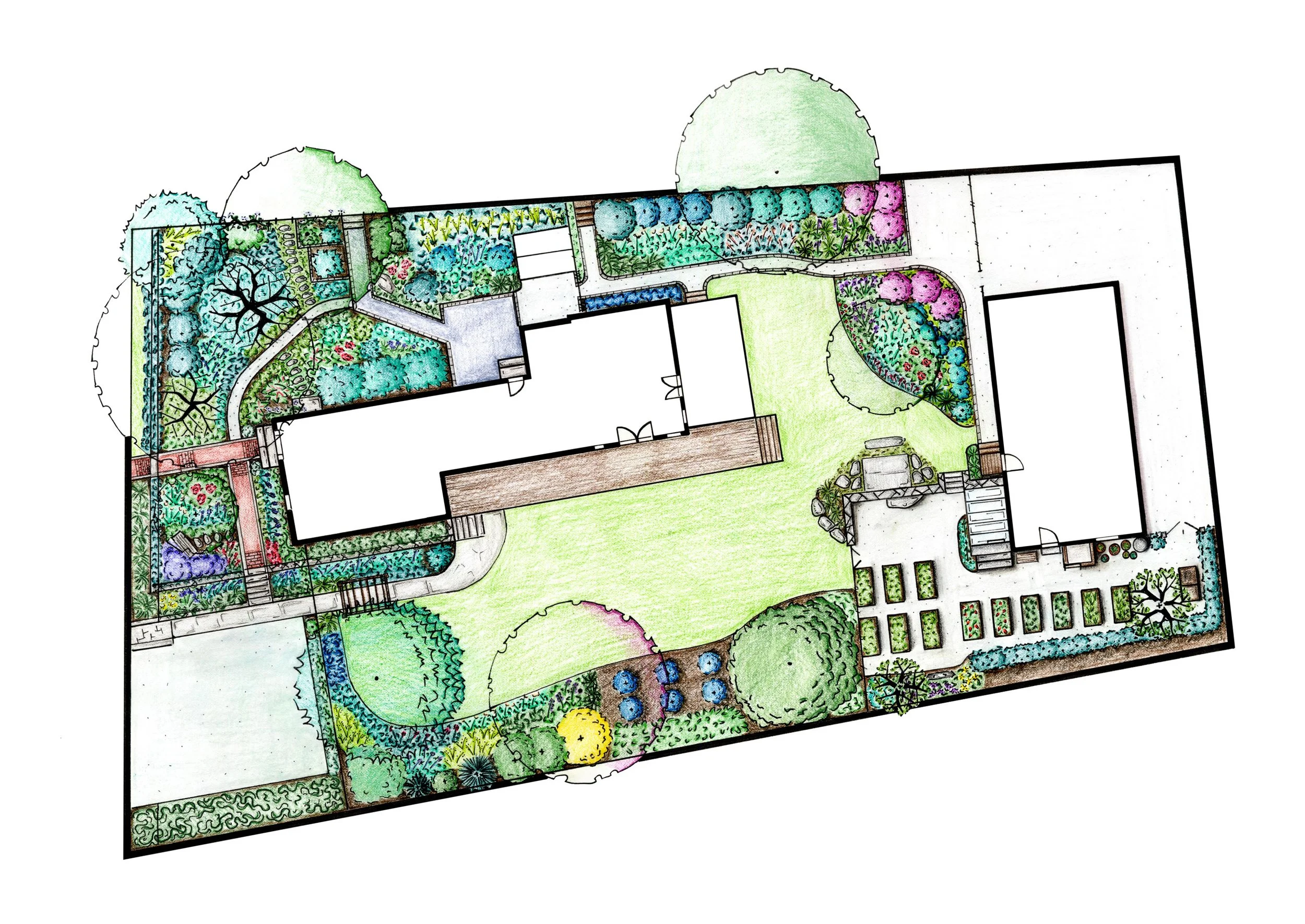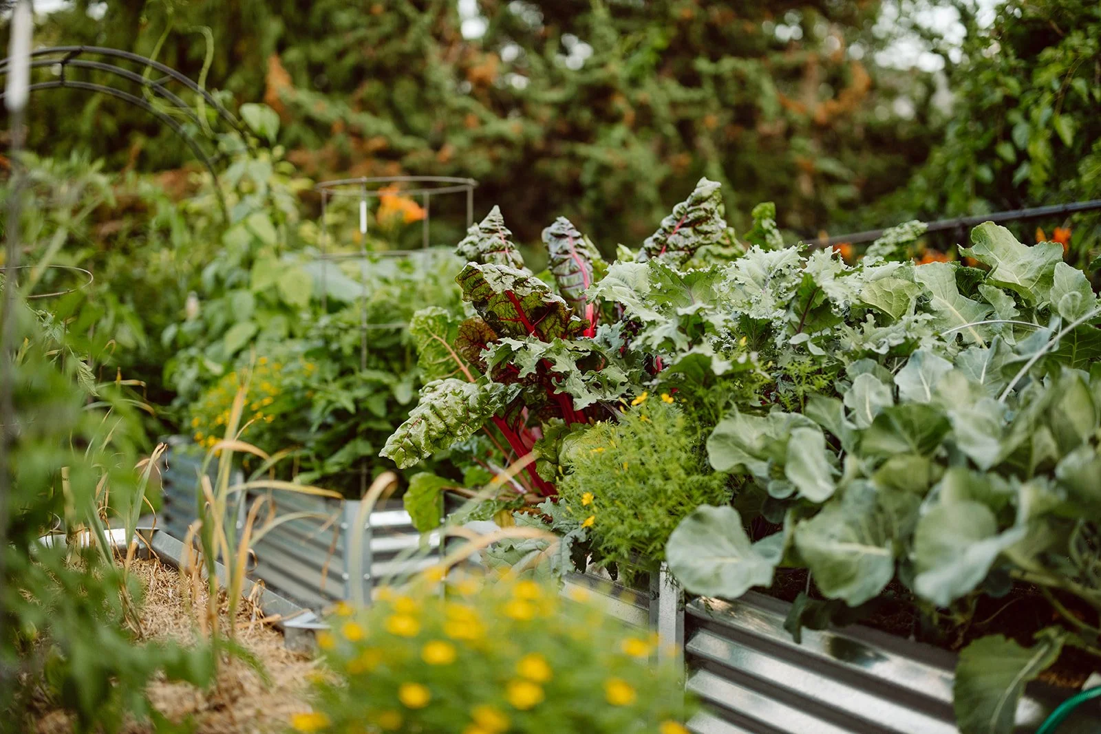 The back garden is where the majority of the work has been focused. The first push was to create the potager garden, with a mix of raised beds and in ground planting beds as well as space for siting and potted plants. A stone wall hugs this space carving it out of the slope. Stone steps through the wall bring you up to the patio, as well as a side gate leading to the lower lawn. The client created the hairpin metal fences and gates himself.