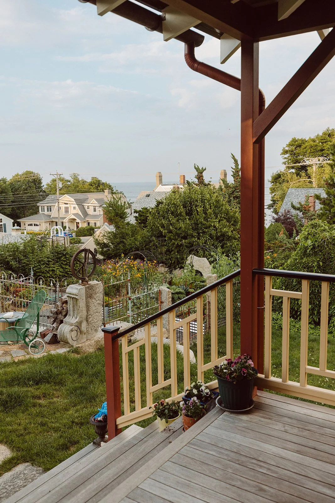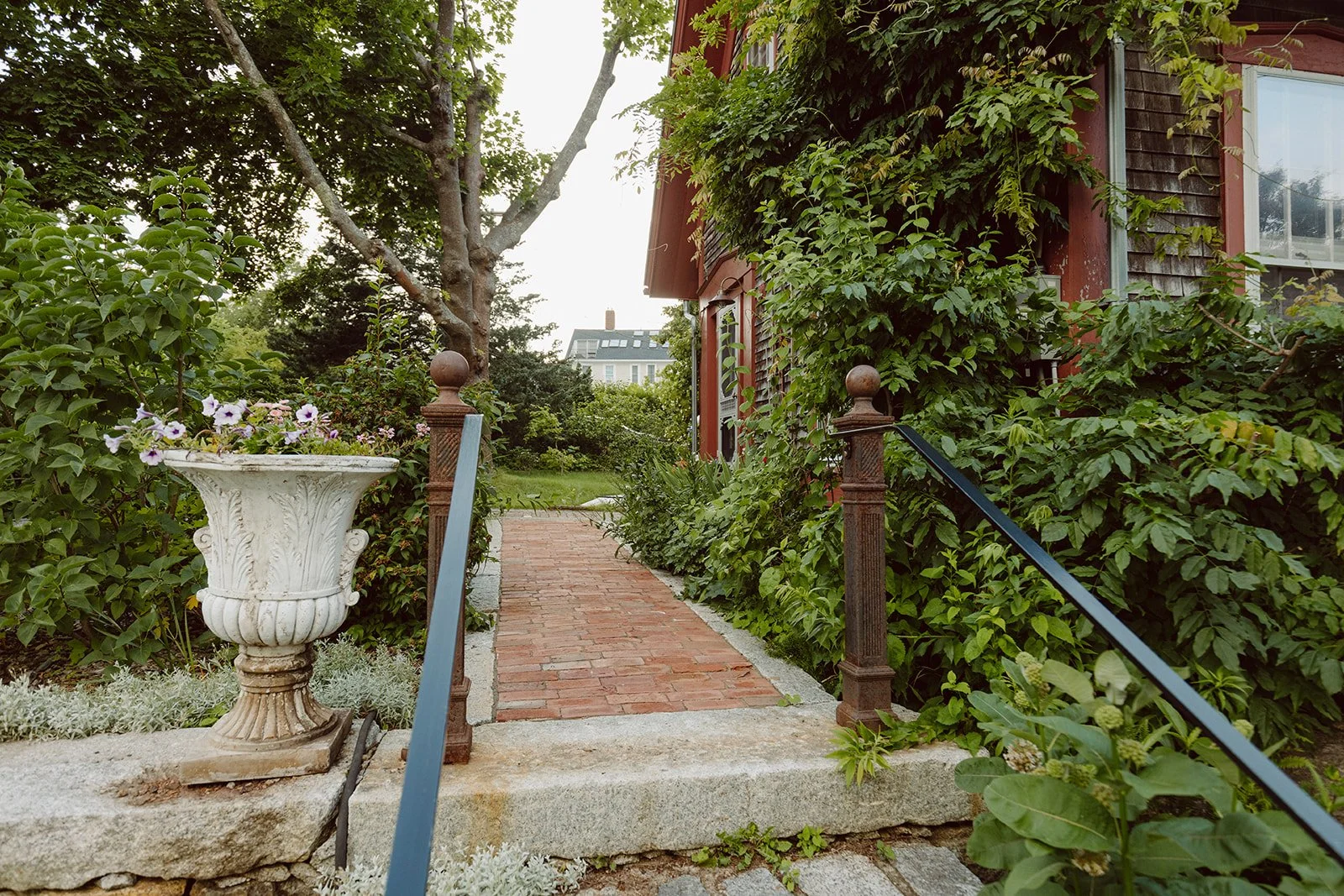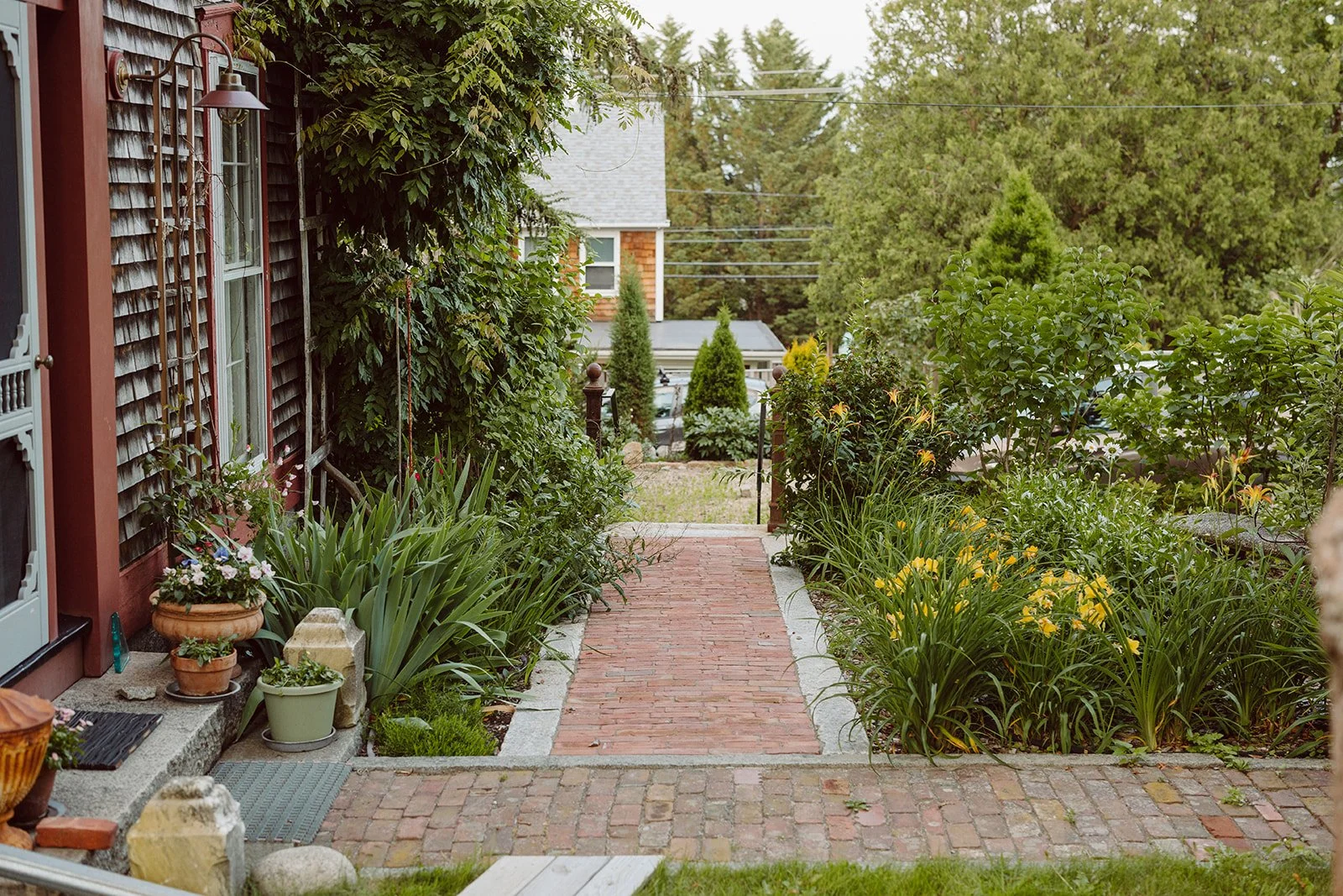 In the front garden a “new” walkway was set, connecting the granite stairs to the old front walk, utilizing recycled bricks and reclaimed granite matching the style of original front walk.